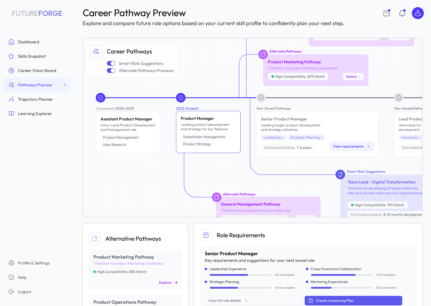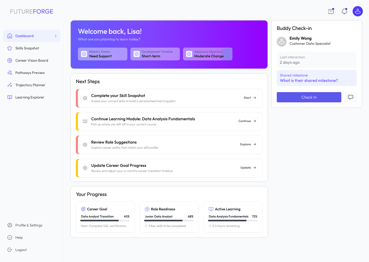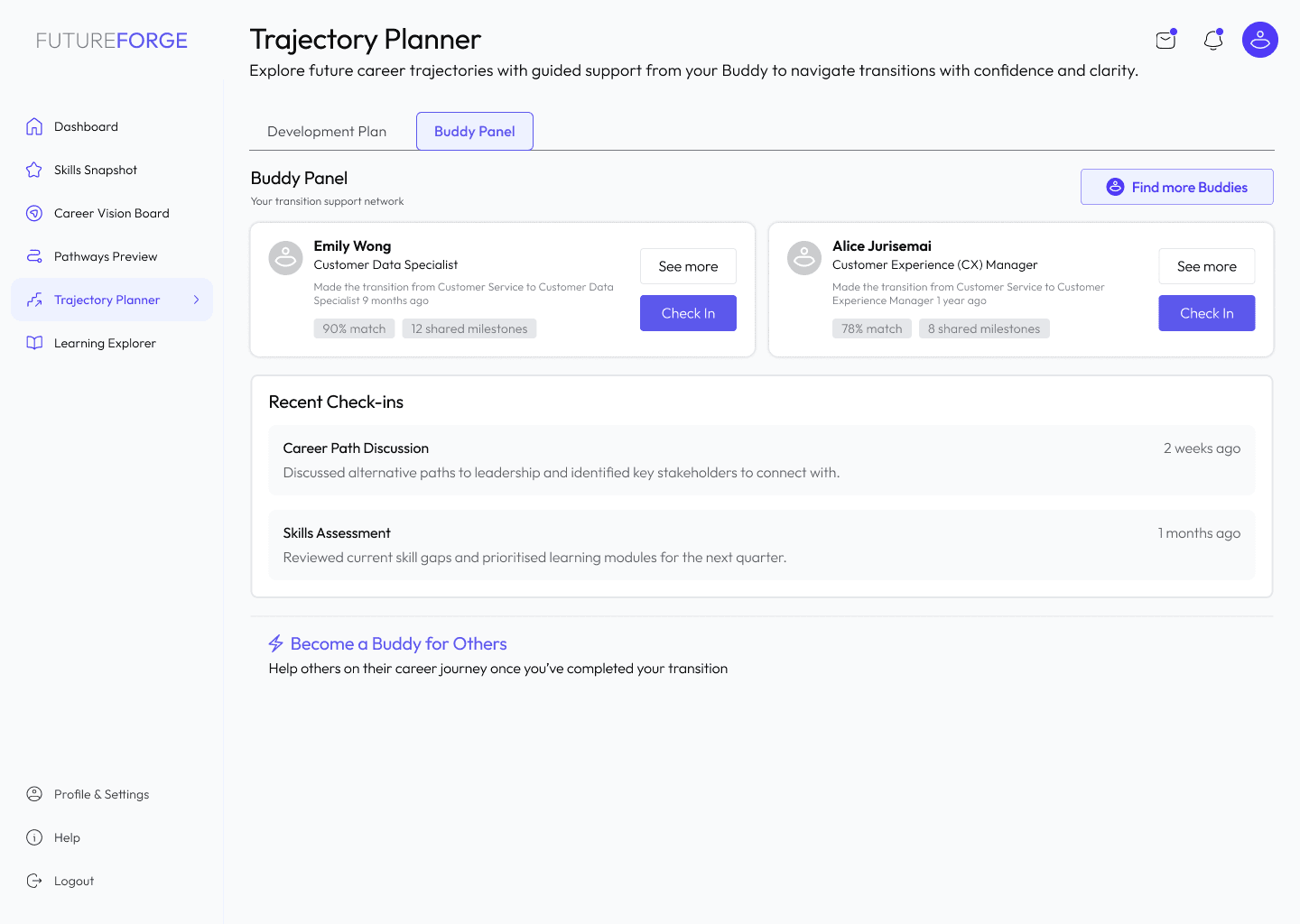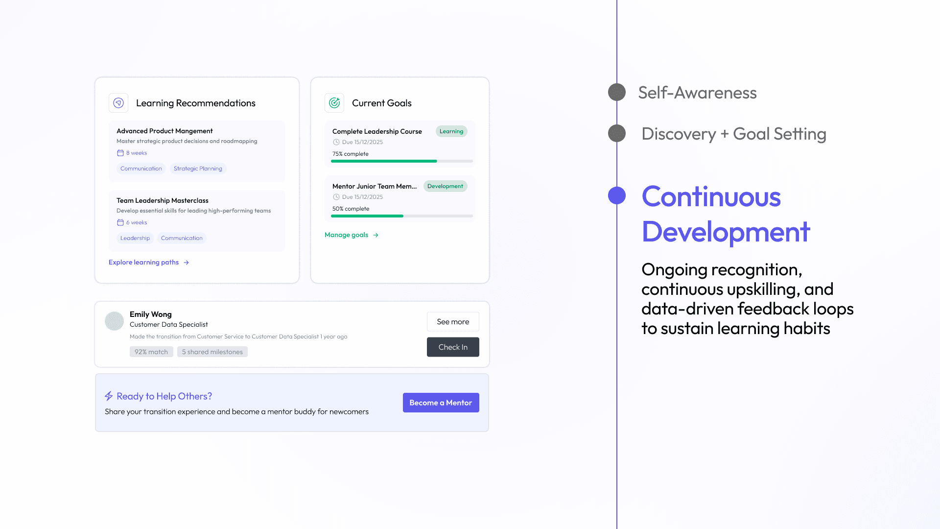 FutureForge addresses this through a Personal Development Dashboard that tracks progress against selected goals, integrates learning recommendations from the internal LMS, and connects employees with peer mentors who have completed comparable transitions. Progress milestones trigger recognition, reinforcing behaviour at the precise moment it is most fragile.