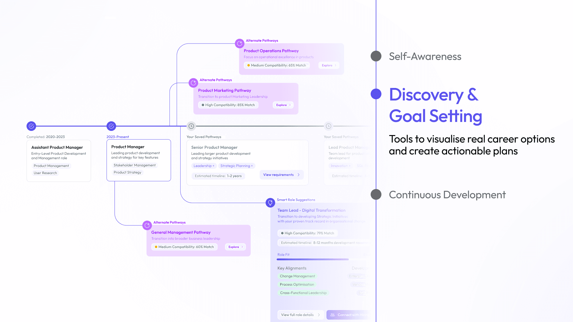 The Career Pathways Visualiser maps realistic transition routes based on each employee’s current profile, adjacent skill clusters, and historical mobility data from comparable colleagues. Comparison Profiles — anonymised stories of employees who made similar moves — make possible futures tangible and relatable. A Live Skills Heatmap shows which capabilities are rising or declining in market demand, grounding personal decisions in external reality.