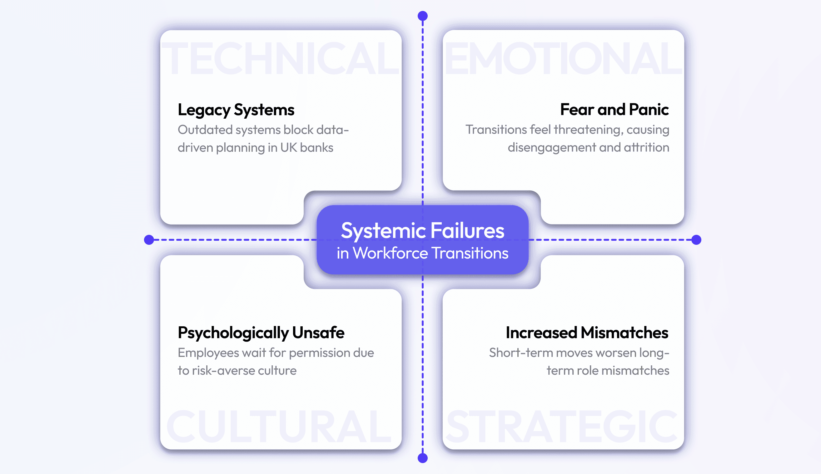Technical failure: HR, learning, performance, and vacancy data sit in silos, blocking role-readiness visibility.