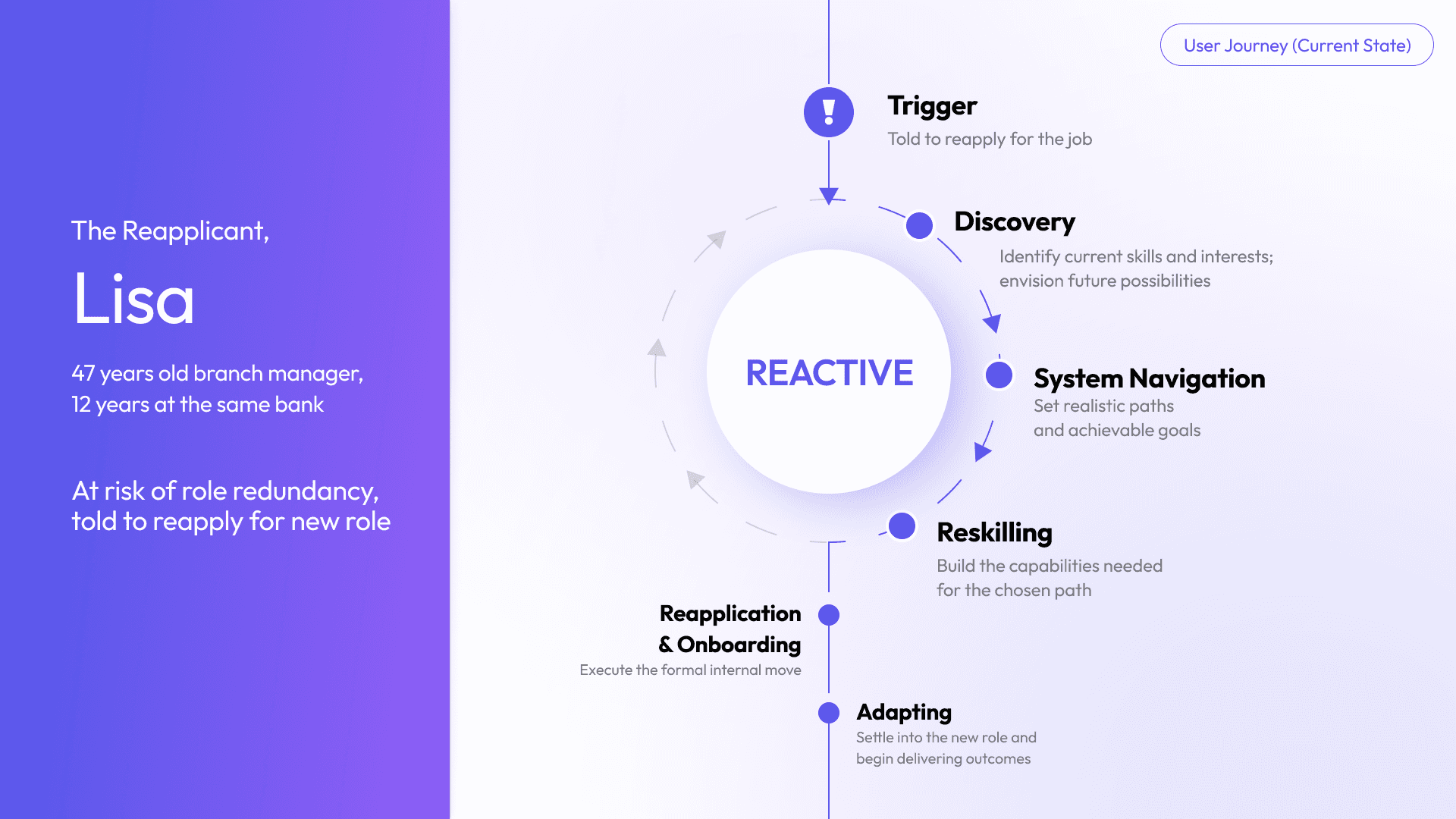 Most employees do not know their role is at risk until it is already being restructured. The first design challenge is making invisible risk visible, without triggering panic.