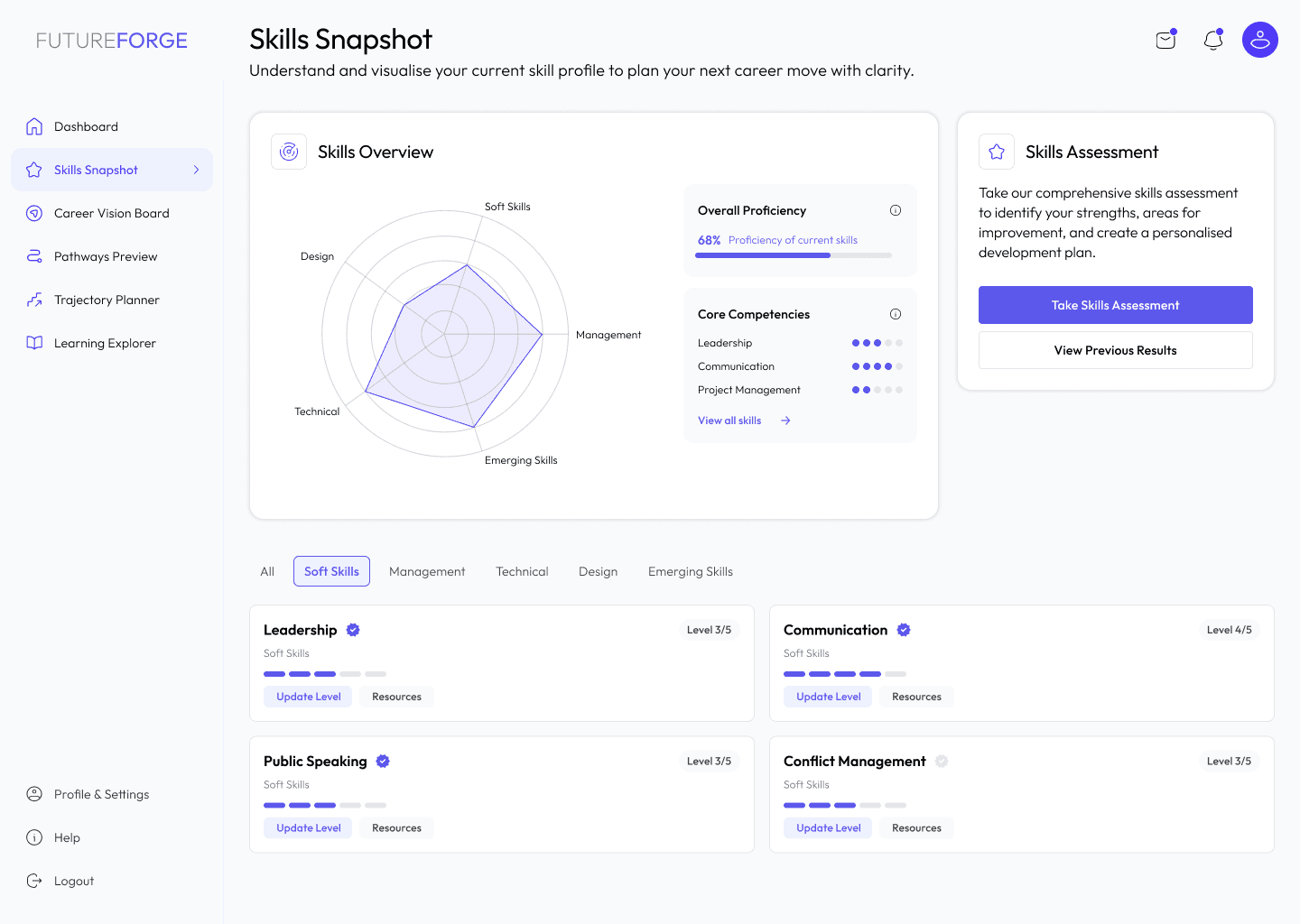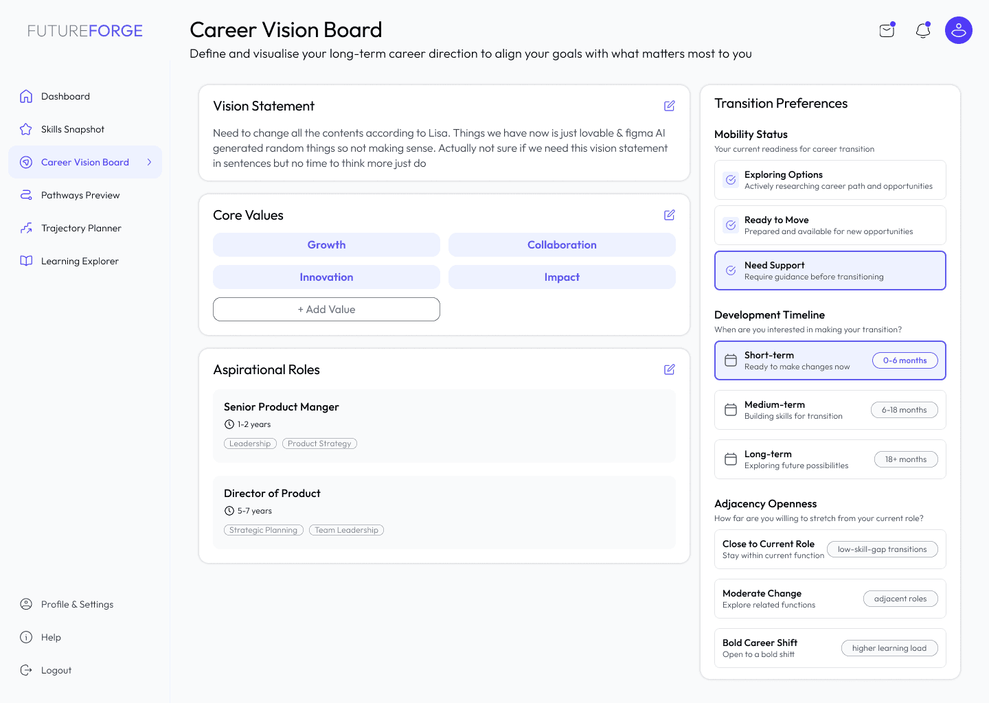 The survey revealed that 70% of respondents would use FutureForge regularly without managerial oversight, and 67% favoured discovery and goal-setting tools as their top desired features. While demand is evident, the necessary infrastructure is lacking.