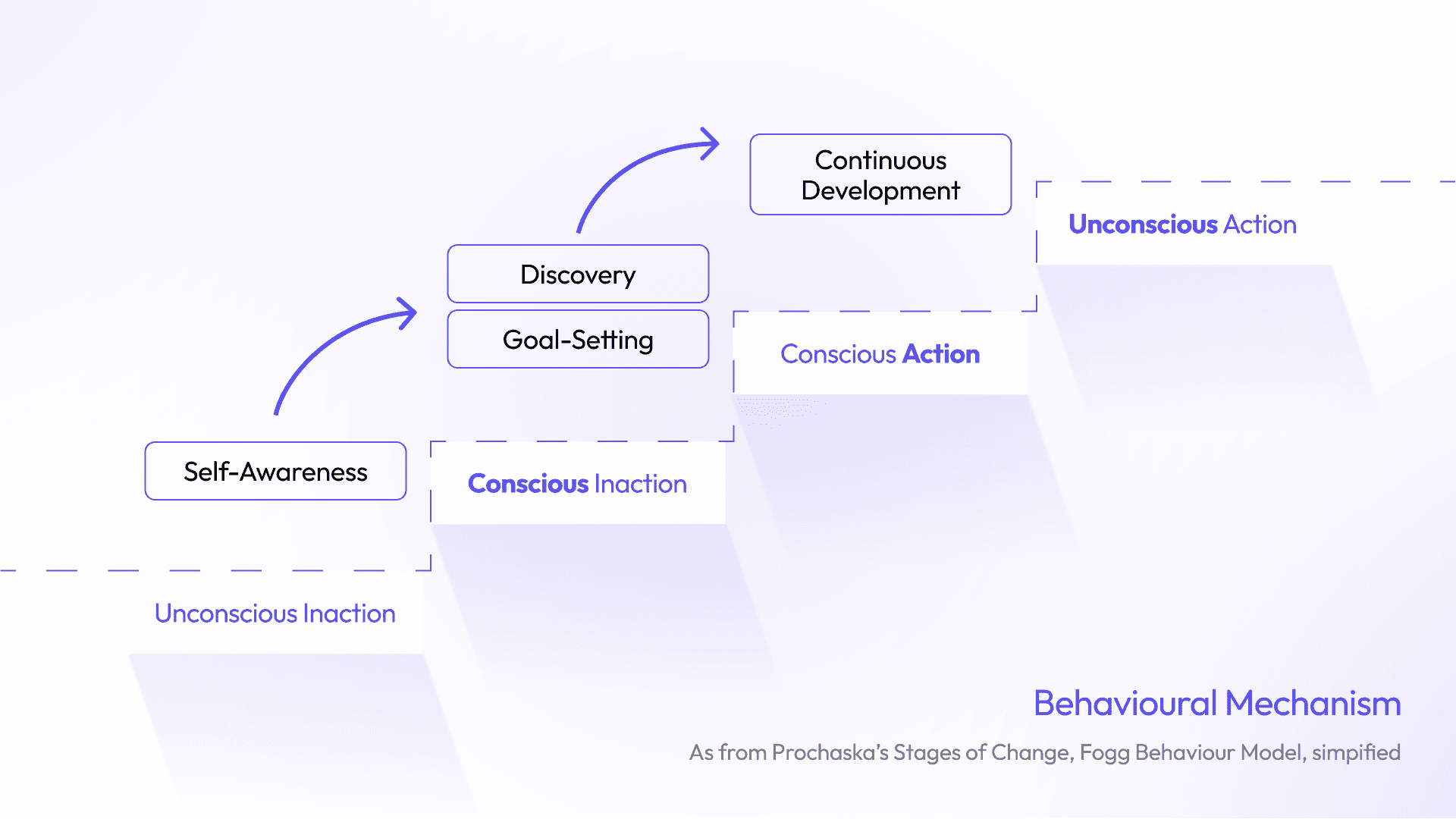 Based on Prochaska’s Stages of Change and Fogg’s Behaviour Model, each stage has distinct emotional and cognitive needs. Our platform’s features are calibrated to meet people where they are.