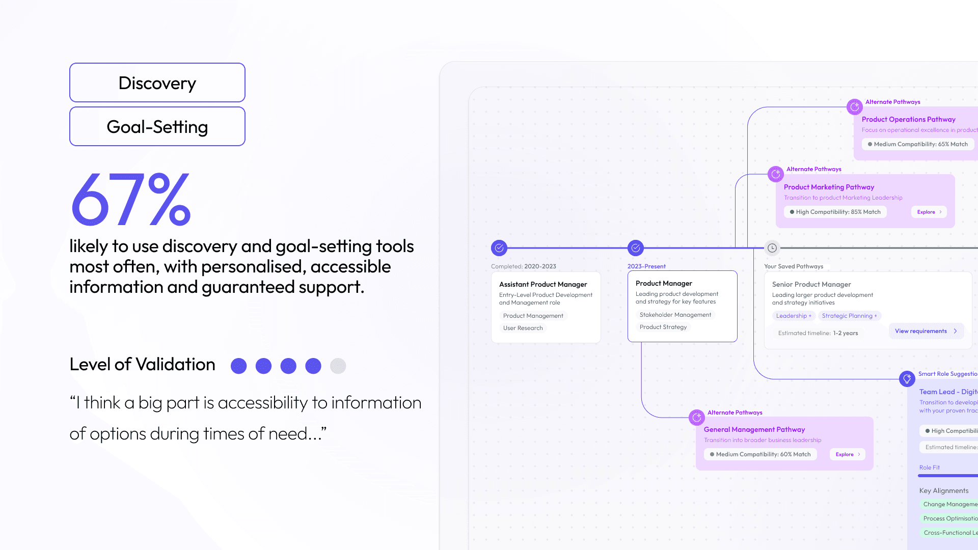 Our prototype testing validated a key hypothesis: when transitions are framed as near-term, achievable steps rather than distant threats, employees are significantly more likely to take action. The prompt “you are two skills away from this role” outperformed generic pathway recommendations in every test.